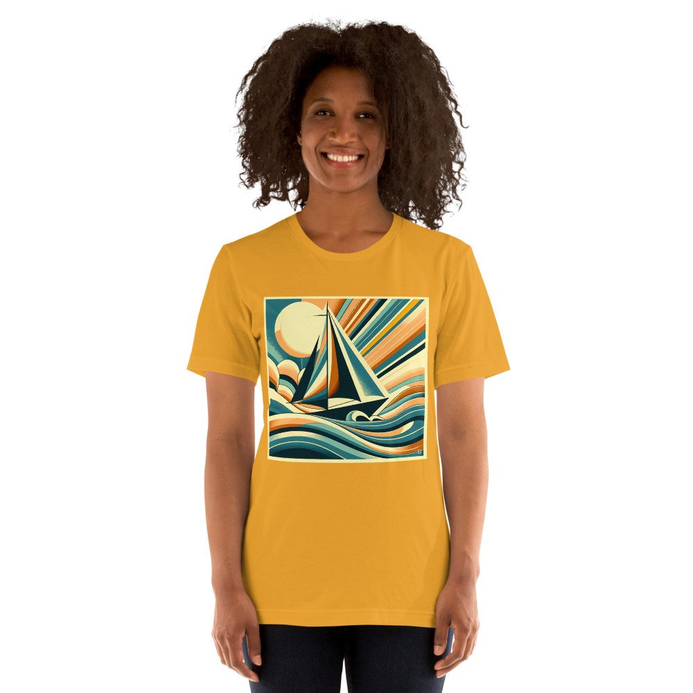 Retro Sailboat with Bold Geometric Waves — T-Shirt