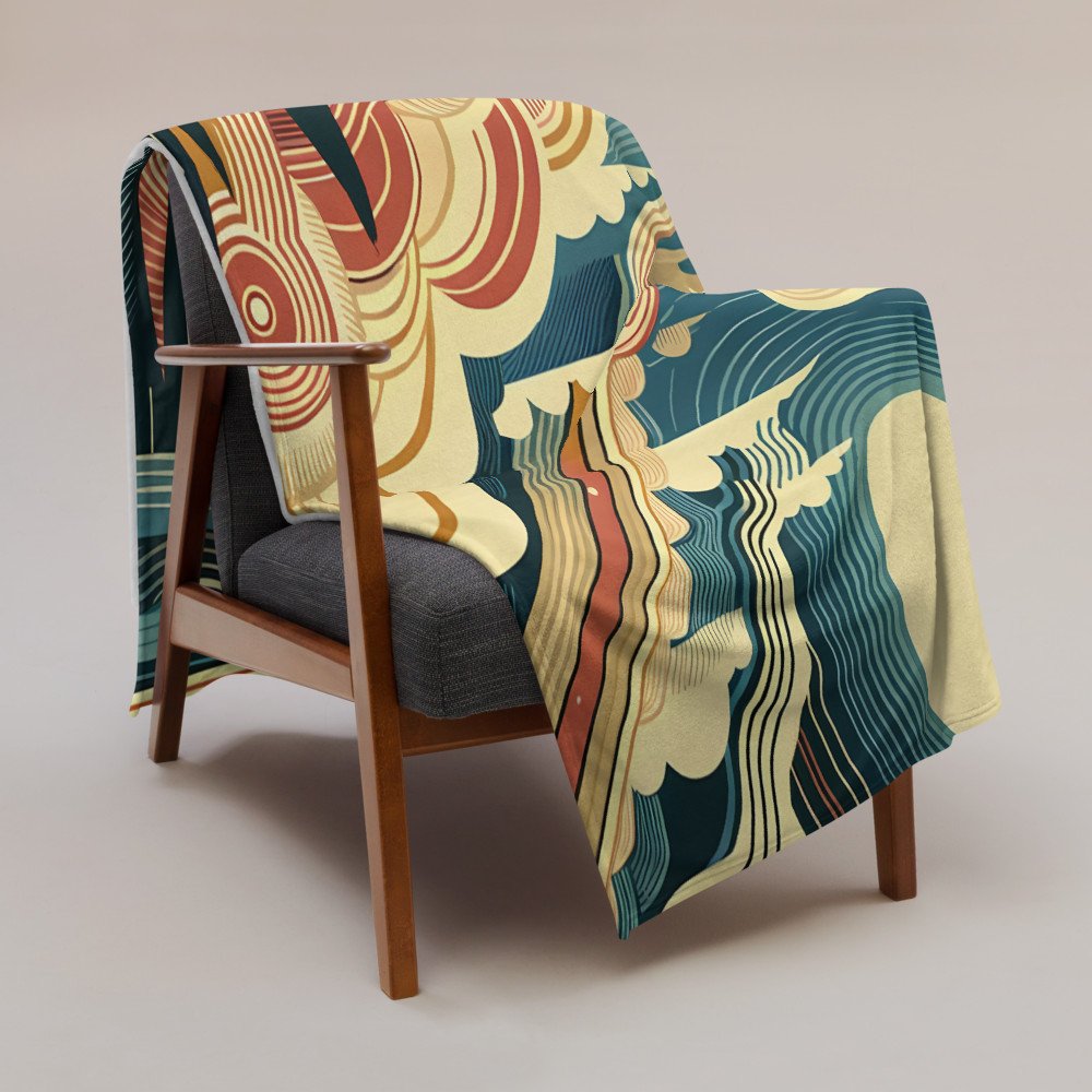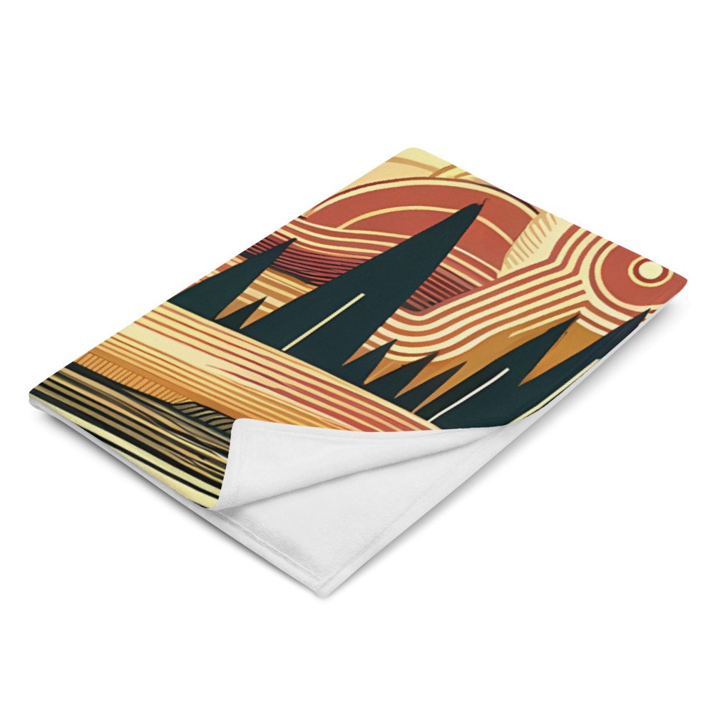 Retro Sunlit Mountain Landscape with Geometric Clouds — Throw Blanket