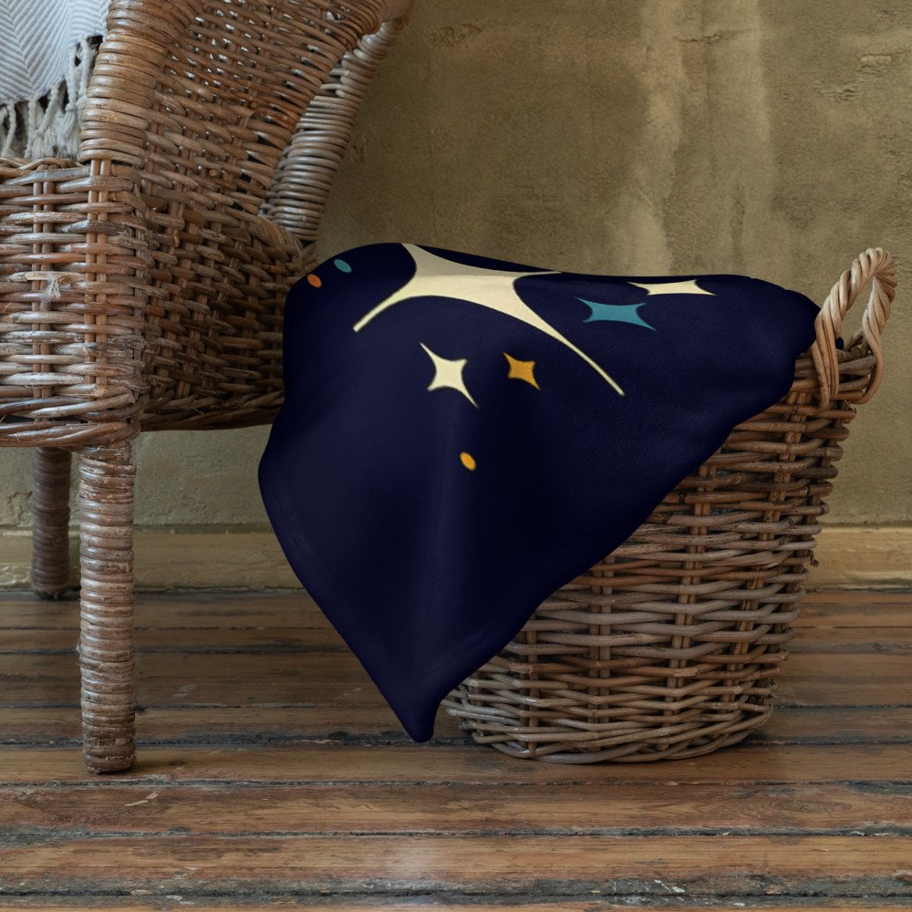The cosy texture of this sherpa fleece throw is a perfect match for the soft curves of the rainbow trails. It’s an ideal piece for relaxing under the graphic rocket and stylised celestial scene.
