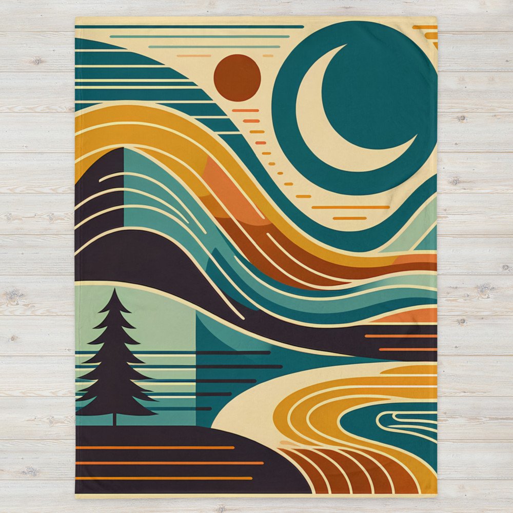 Retro Topographic Landscape with Moon and Pines — Throw Blanket