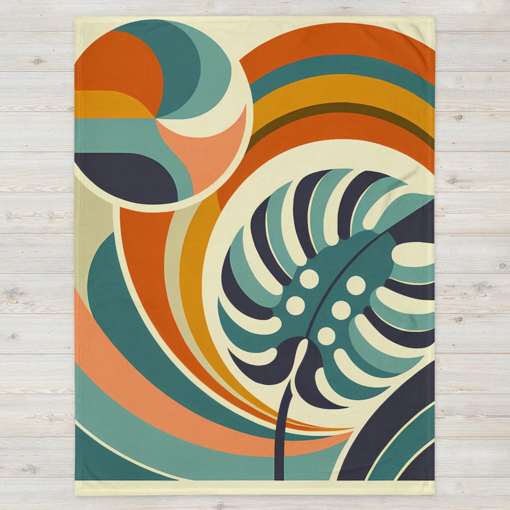 Wavestrider BloomAbstract Monstera Leaf with Retro Rainbow Waves — Throw Blanket
