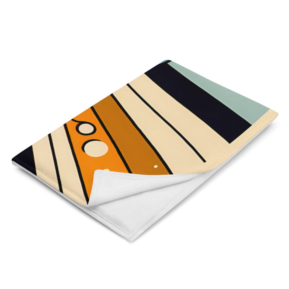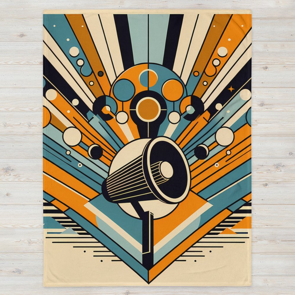 A stylised megaphone sits at the centre of a radiant composition of circles, stripes and angular beams in orange, teal, cream and black. The design blends bold typography energy with abstract type influences through strong letterform-like shapes and a clean retro-futurist layout. Crisp outlines and balanced geometry give it a striking graphic presence.