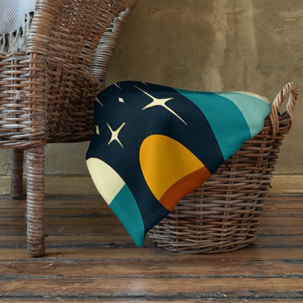 The soft sherpa fleece of this throw is ideal for cosy evenings, adorned with a serene geometric forest. The cool teal and cream pattern of stylised pines and a celestial snowflake adds a tactile layer of winter comfort.