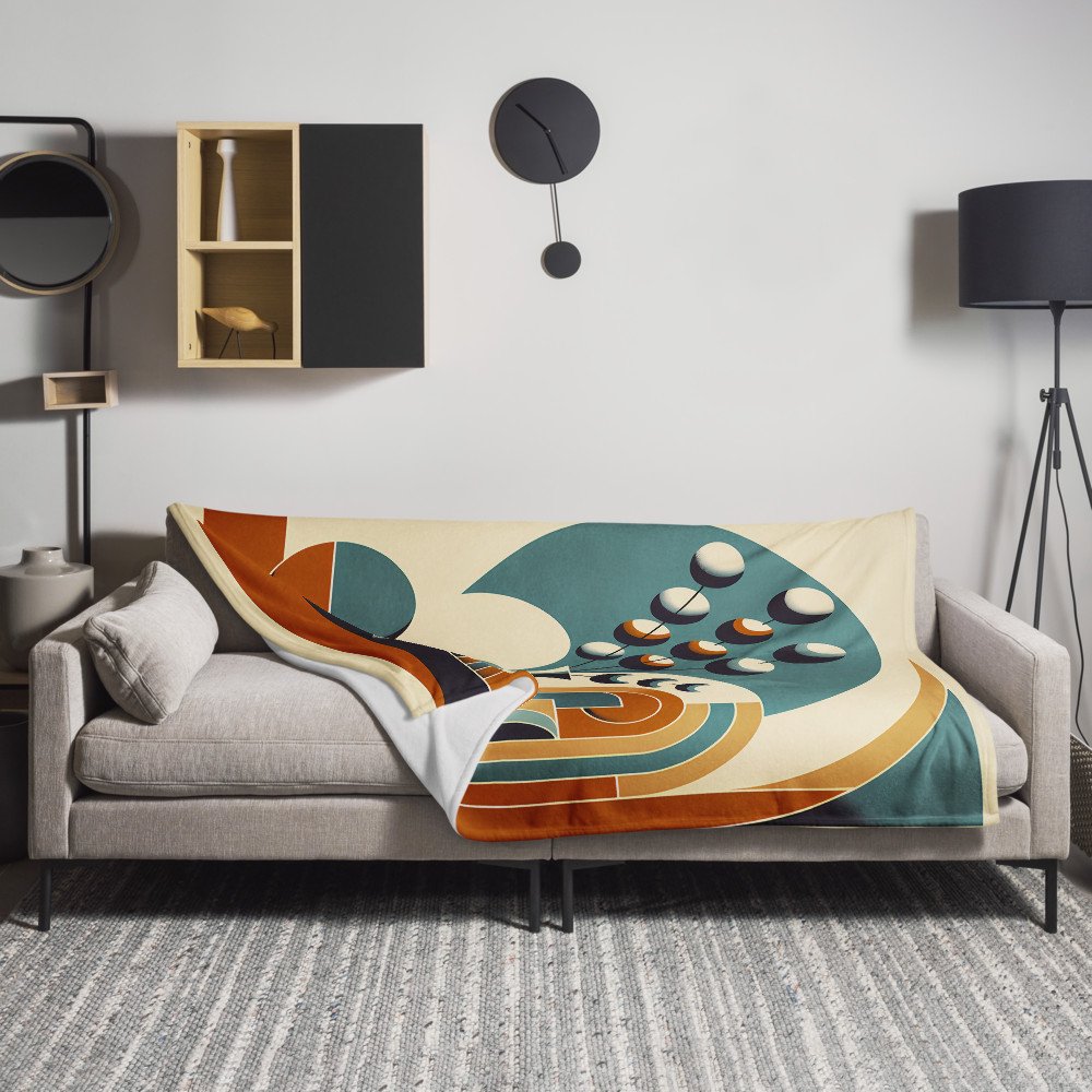 The soft sherpa fleece of this throw is printed with the warm, balanced geometry of arches and organic shapes. It’s a cosy, textured way to display the serene teal and burnt orange art.