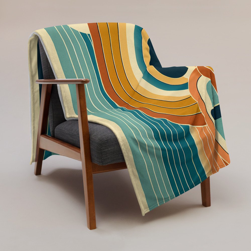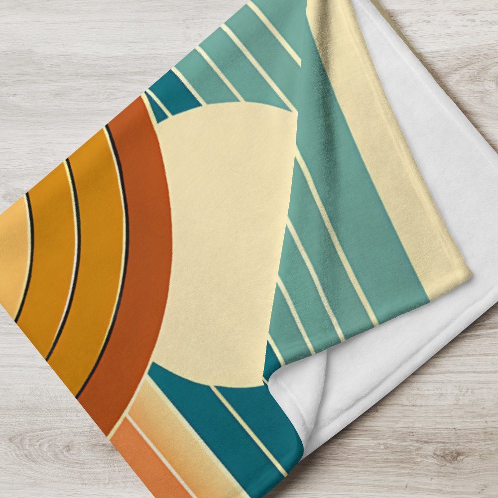 The geometric arches pattern is woven into the soft, cosy surface of this sherpa fleece throw. Its warm ochre and rust tones set against a teal sky create an inviting, textured landscape for relaxation.