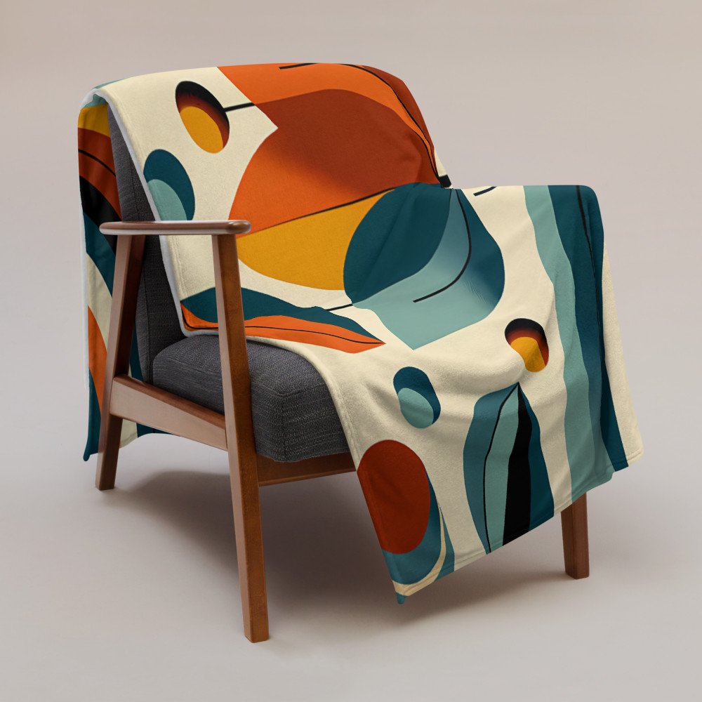 Sherpa fleece makes this 50-by-60 throw a soft companion for cooler evenings, while the geometric bloom repeats across the fabric in teal and ochre. The sweeping arcs and layered leaves feel like a gentle, modern pattern against the cosy fleece backing. It’s for curling up with a book and a bit of abstract warmth.