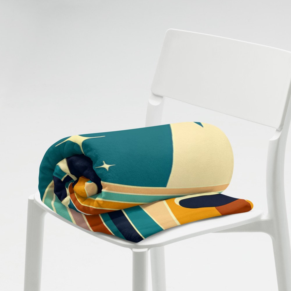 The cosy, soft sherpa fleece of this throw is printed with the serene desert and starlight scene. Its 50"×60" size is ideal for wrapping up with the warm teal and amber tones of this retro illustration.