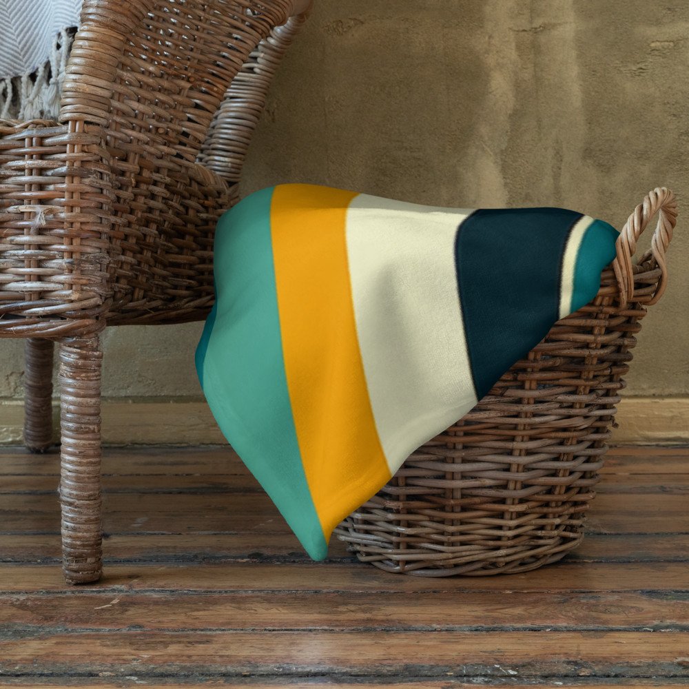 This soft sherpa fleece throw is printed with the serene, layered waves and sailboat motif. The cosy fabric and deep navy background make the amber sun’s concentric arcs feel warm and inviting.