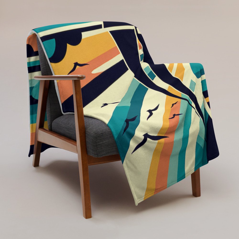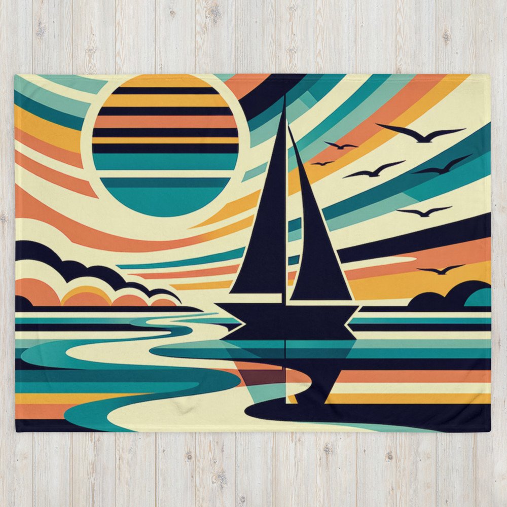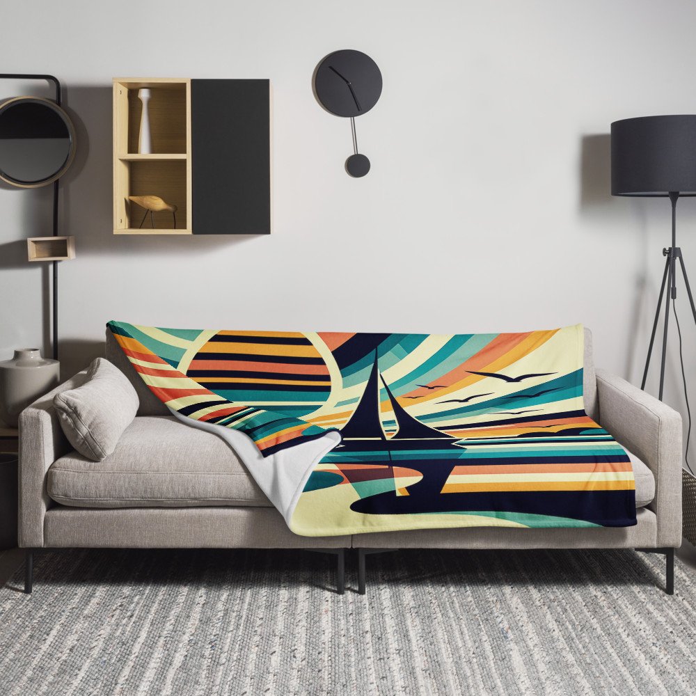 This sherpa fleece throw wraps you in the warm-toned geometry of a seaside evening. The sailboat glides across a coral-and-cream sky, while the teal water and curved reflections add gentle motion beneath your hands. Cosy and generously sized at 50 by 60 inches.