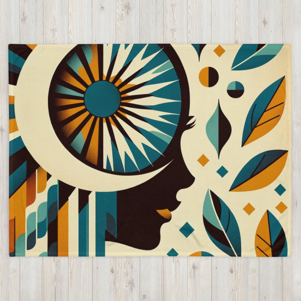 Amber SolsticeAbstract Face with Sunburst Eye and Leaves — Throw Blanket
