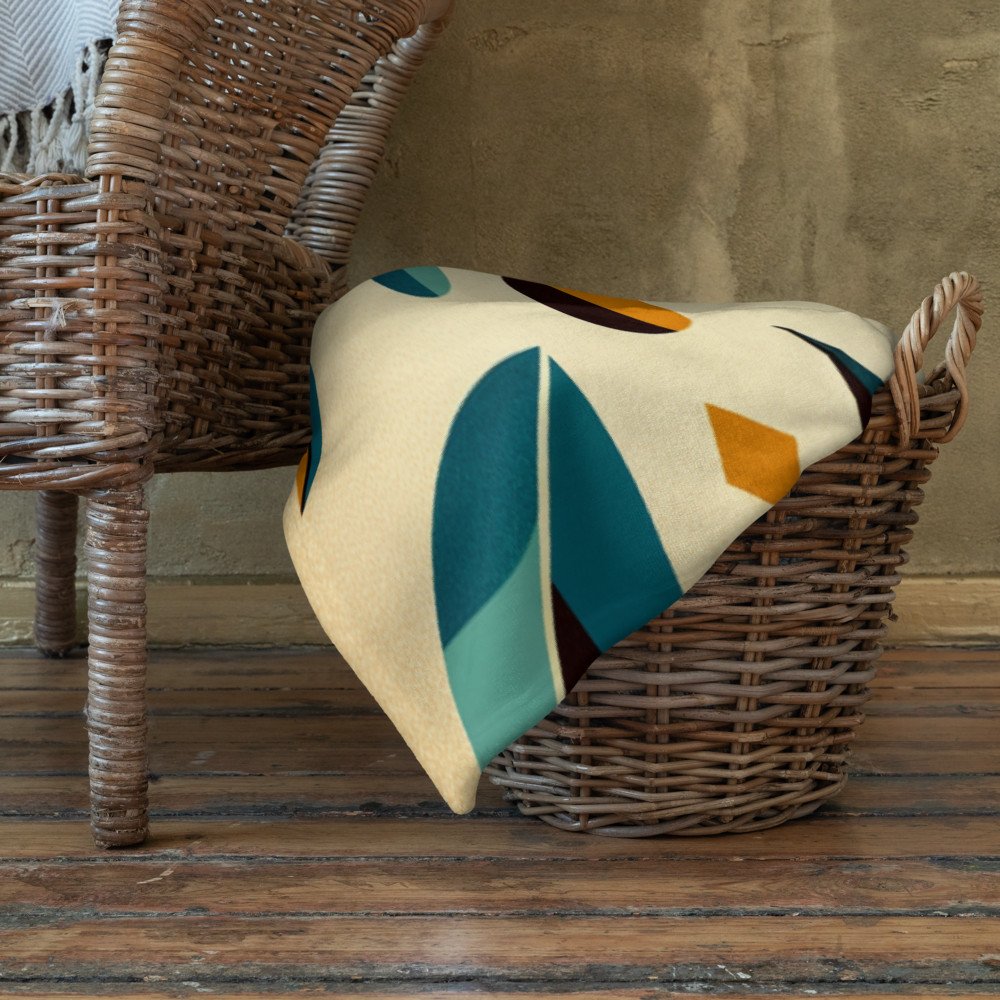 The soft sherpa fleece of this throw provides a tactile background for the striking design. Curl up under the geometric face, where the warm amber and cool teal forms create a visually engaging focal point.