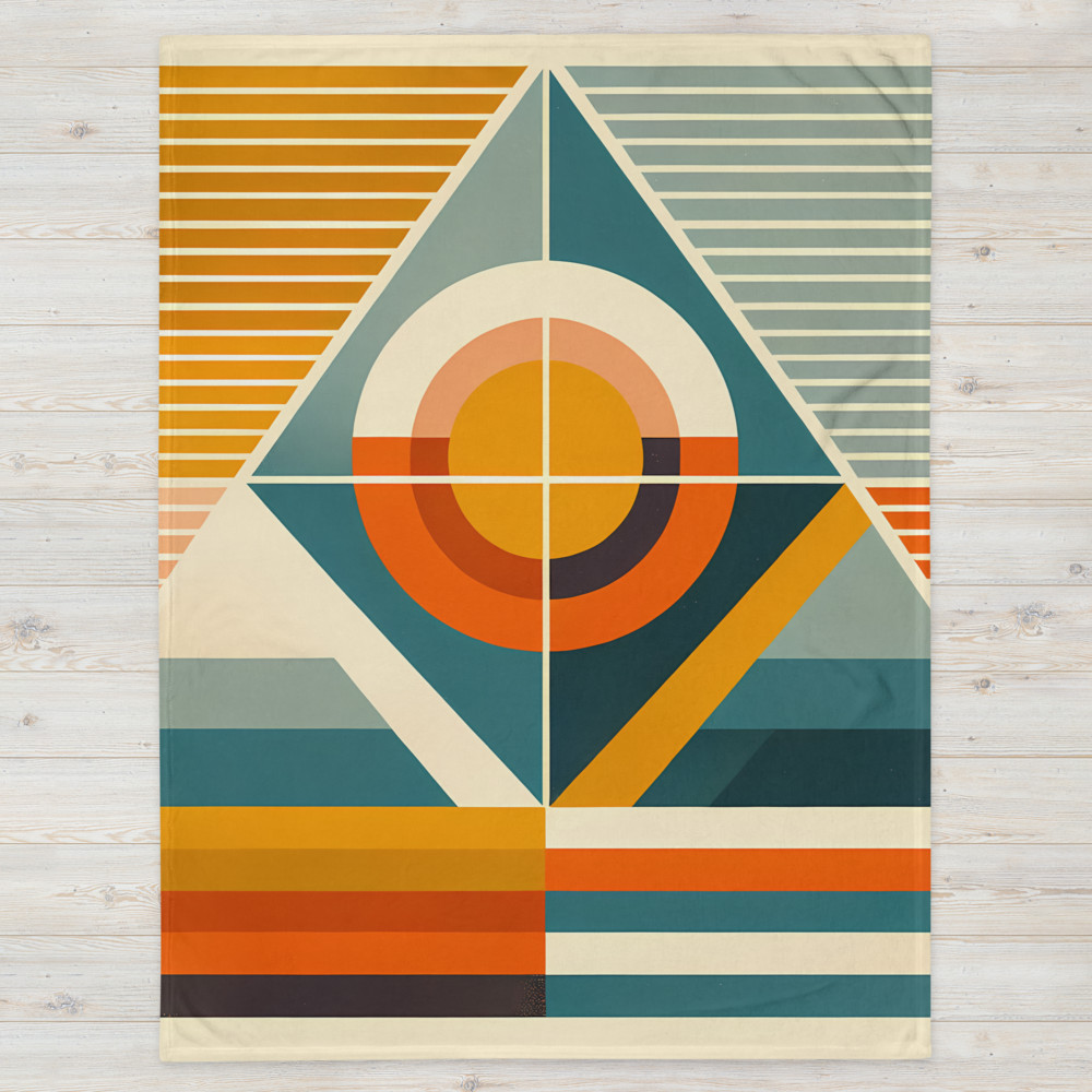 Ochre MeridianRetro Geometric Sun and Triangle Composition — Throw Blanket