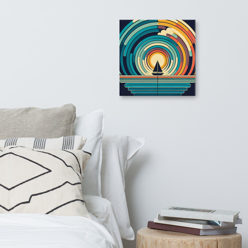 A stylised sailboat silhouette sits on layered waves beneath a glowing sun. Concentric arcs form a bold, retro-inspired sky with a small cloud detail. The palette blends teal, cream, mustard, and coral on a deep navy background.