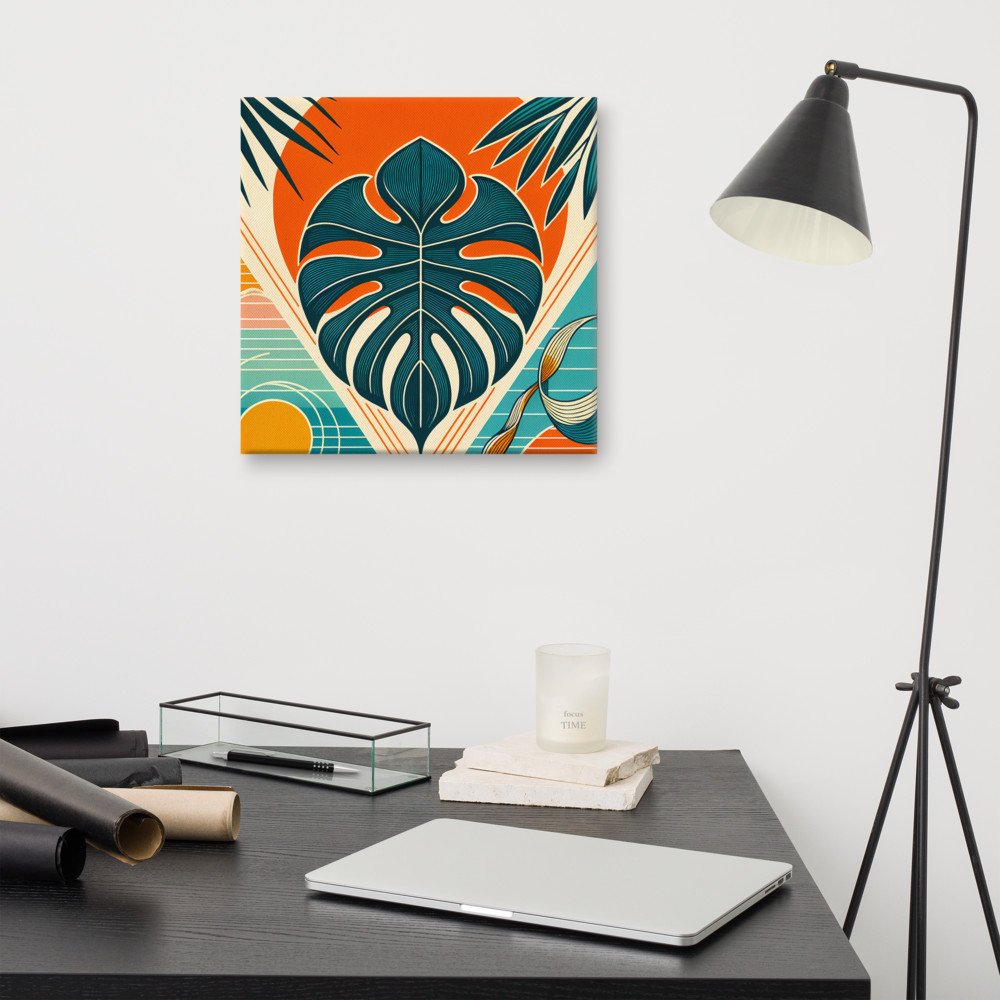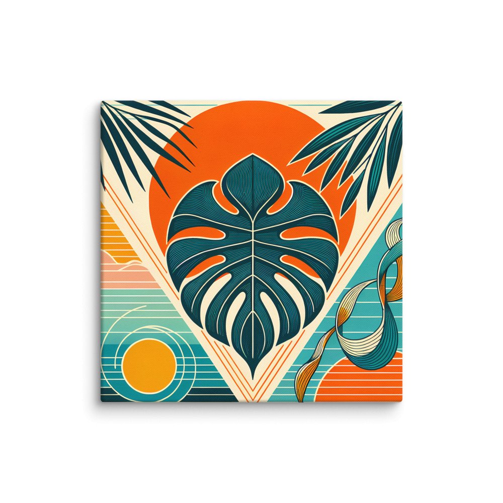 A bold monstera leaf sits at the centre of a geometric sunset composition, framed by palm fronds and layered stripes. Clean linework and organic shapes combine with warm orange and cool teal tones for a modern, retro-inspired look. This abstract botanical design balances minimal plant art with crisp, graphic symmetry.
