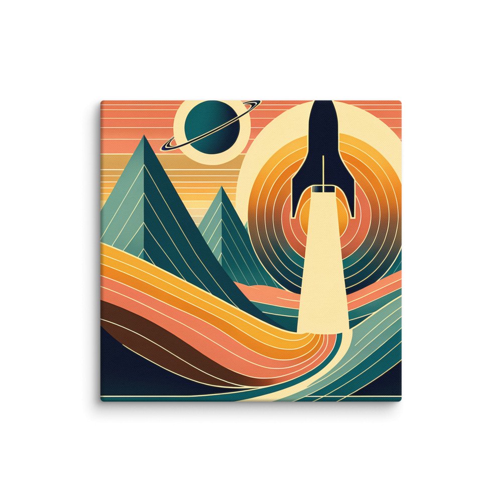 Retro Rocket Launch Over Geometric Mountains — Canvas Print