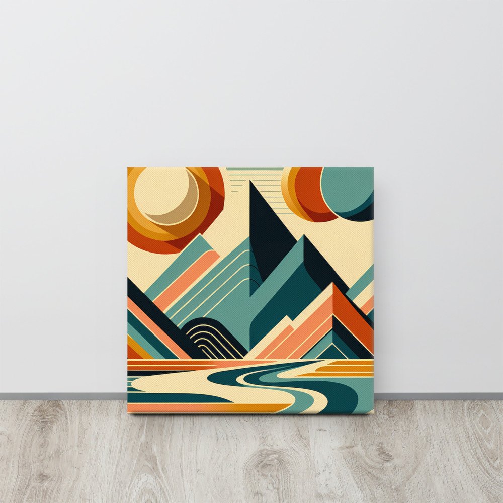 Geometric Mountains with Twin Suns and River — Canvas Print