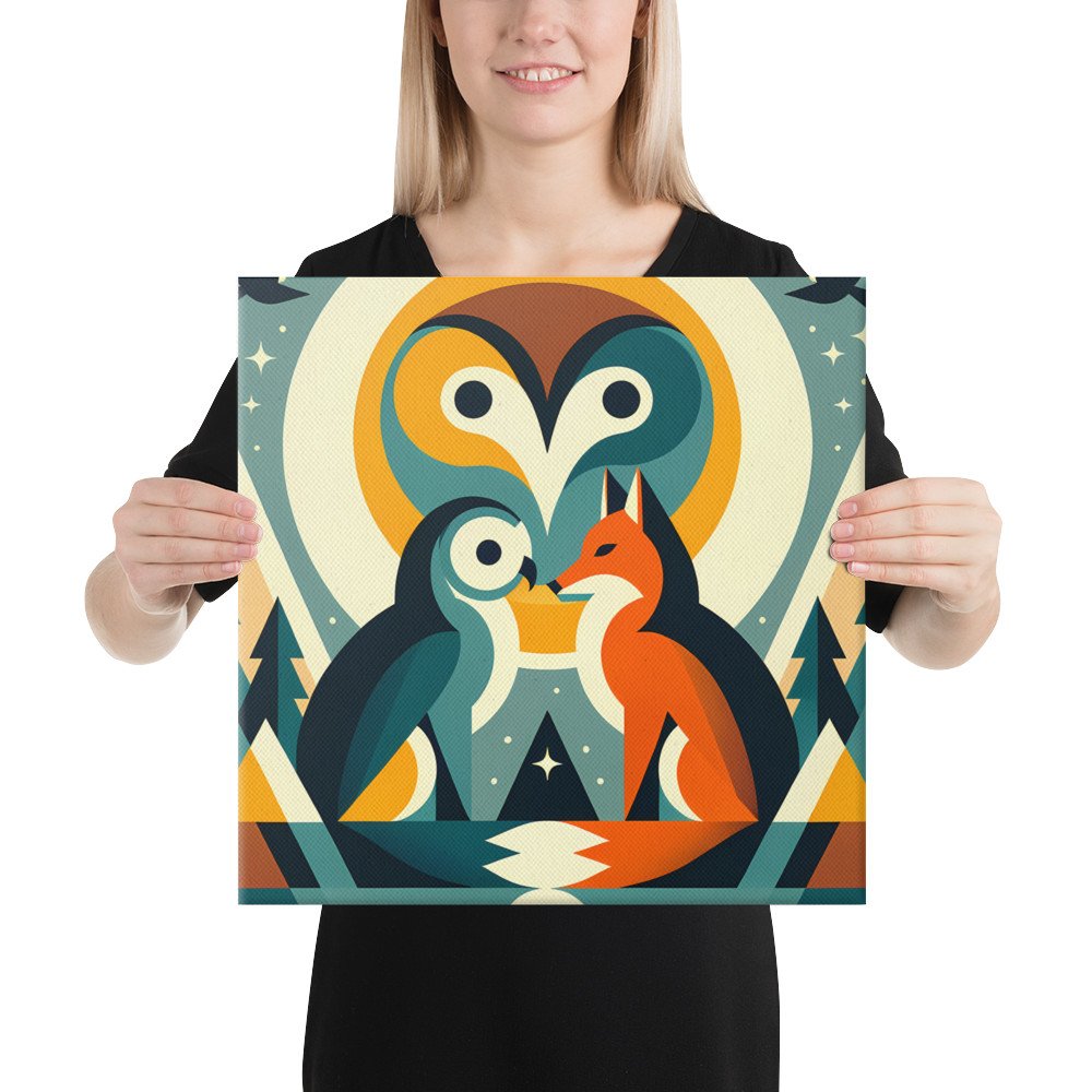 A geometric wildlife illustration featuring a stylised owl face framing an owl and fox in the foreground. Bold circles, triangles, and layered shapes create a moonlit forest scene with stars and flying birds. The palette blends teal, navy, cream, and warm orange for a modern, retro-inspired look.