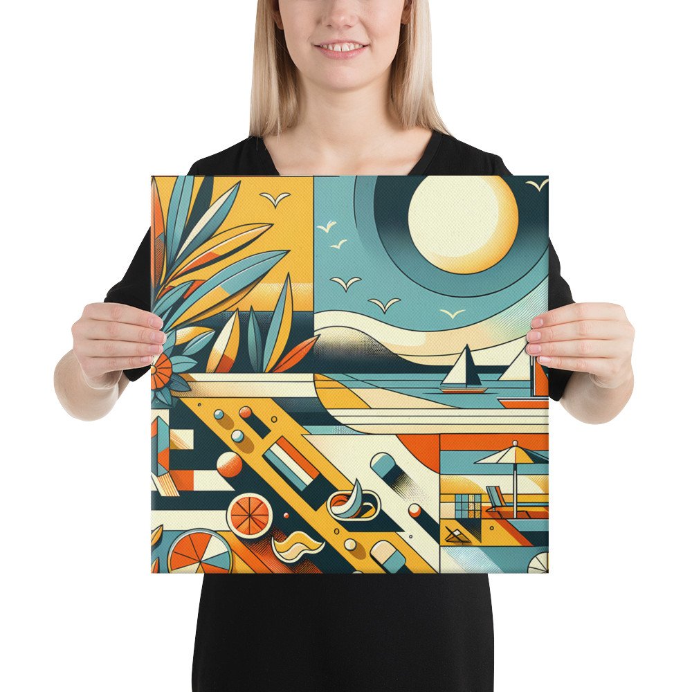 Retro Geometric Beach Sunset Sailboats Illustration — Canvas Print