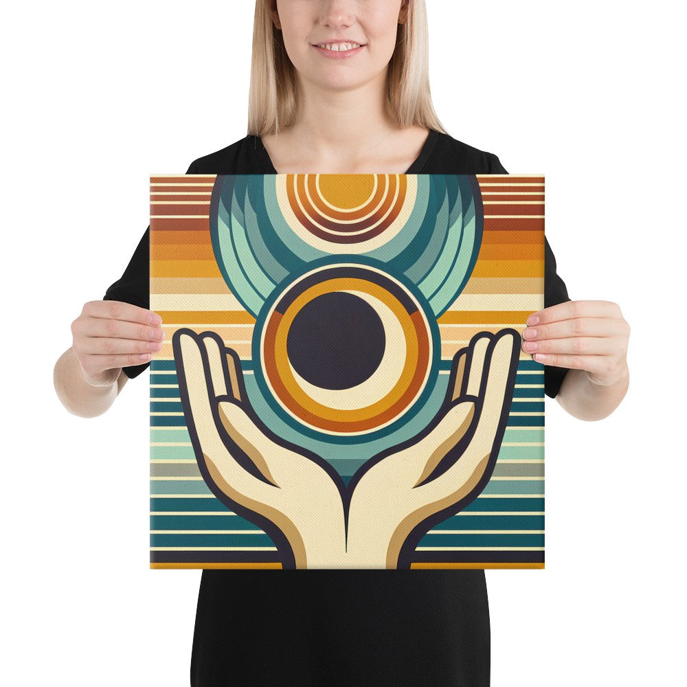 Celestial CradleRetro Geometric Hands Holding Sun and Moon — Canvas Print