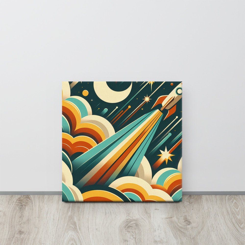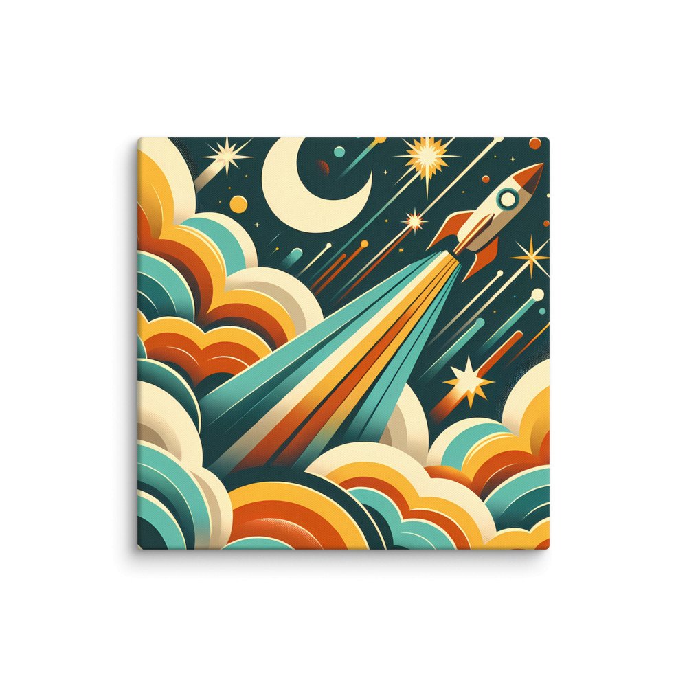 Retro Rocket Launch Through Clouds and Stars — Canvas Print