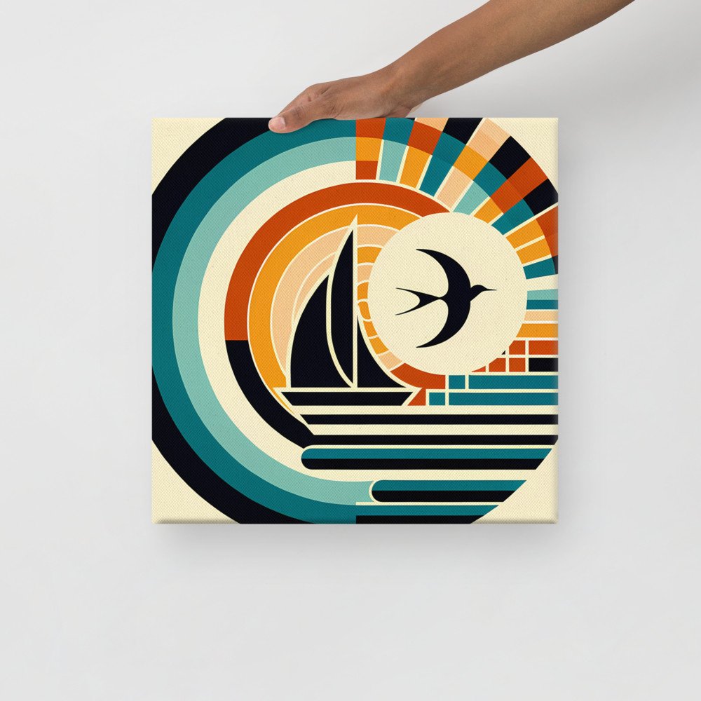 Geometric Sailboat and Swallow Sunset Emblem — Canvas Print