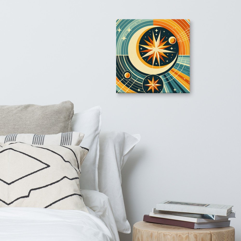 Geometric Crescent Moon and Starburst Orbit — Canvas Print