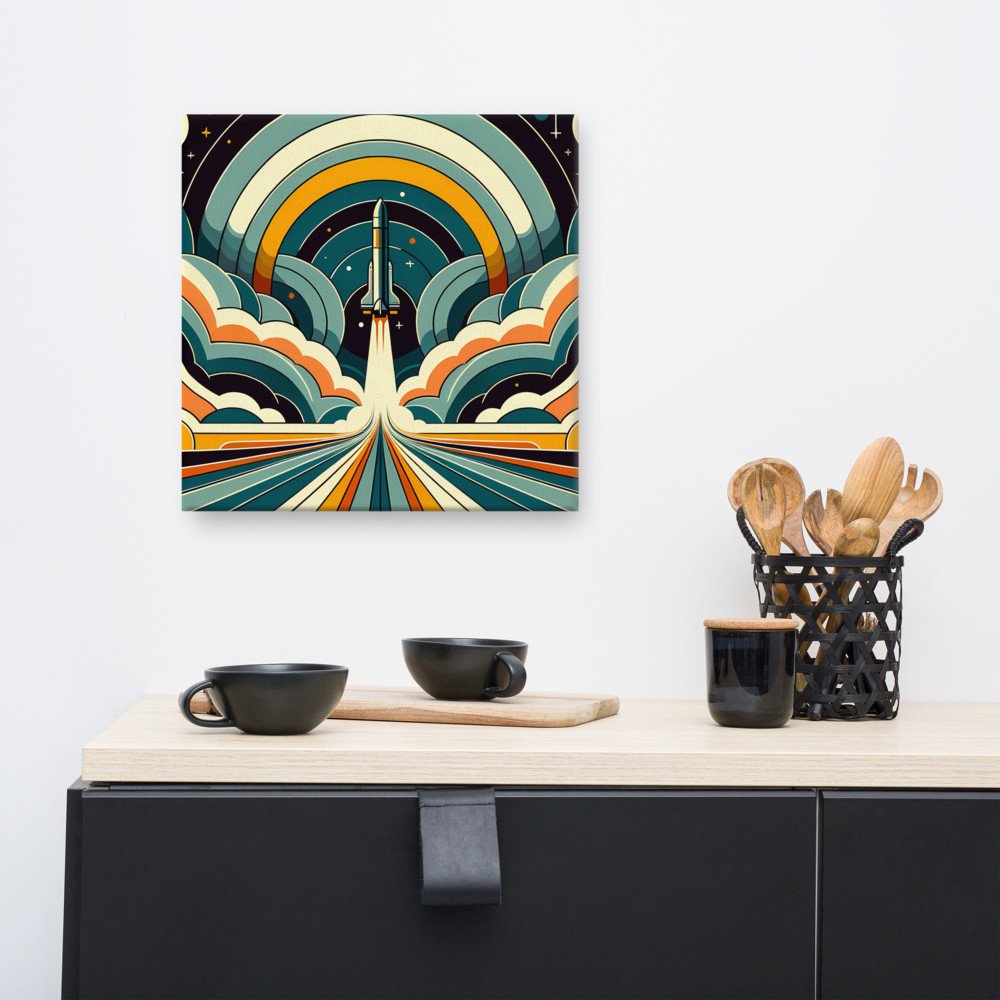 Retro Rocket Launch Through Geometric Clouds — Canvas Print