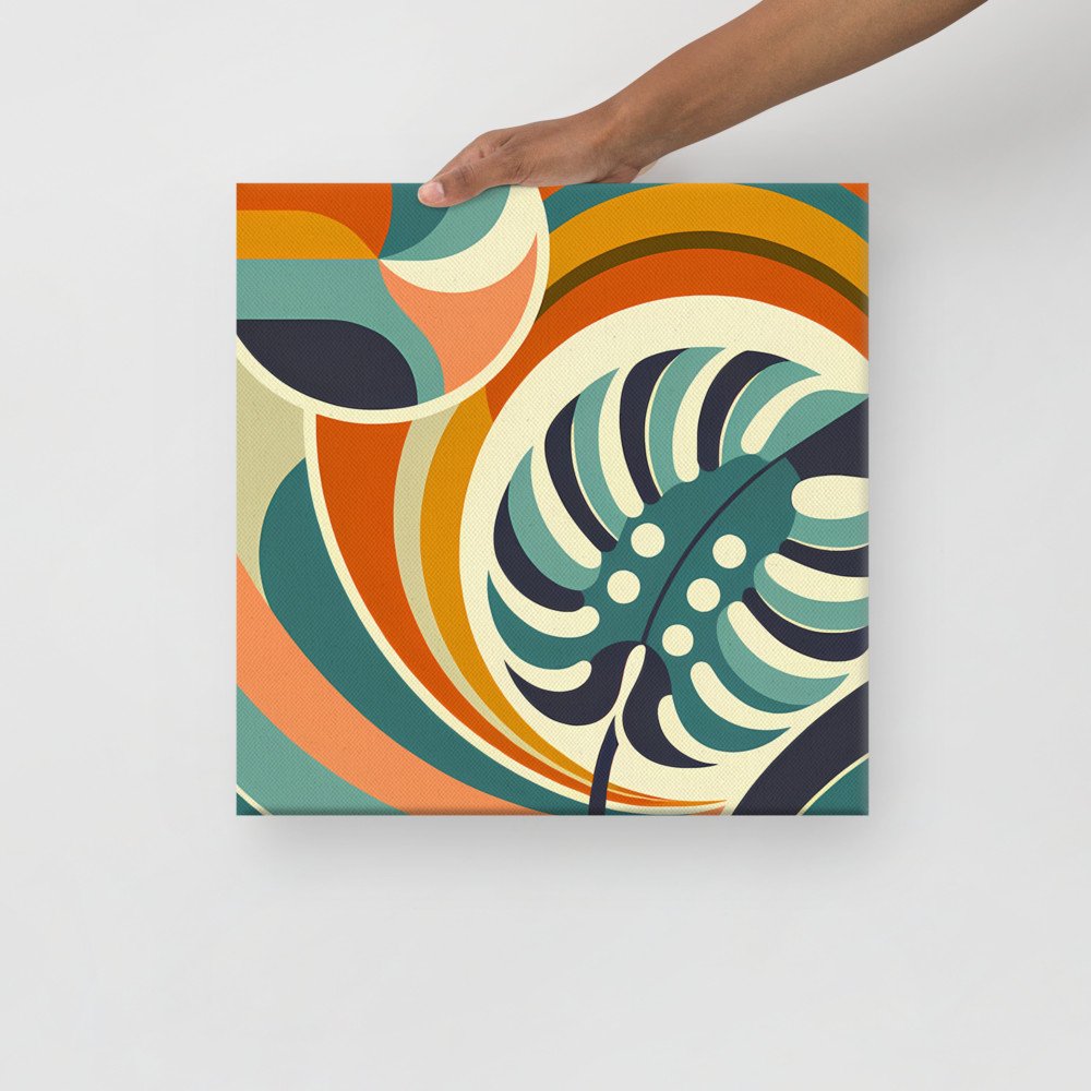 Abstract Monstera Leaf with Retro Rainbow Waves — Canvas Print