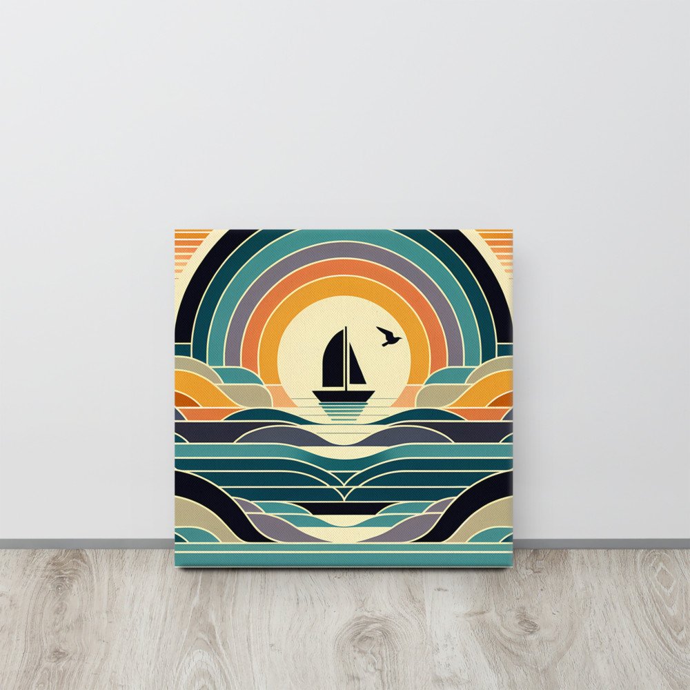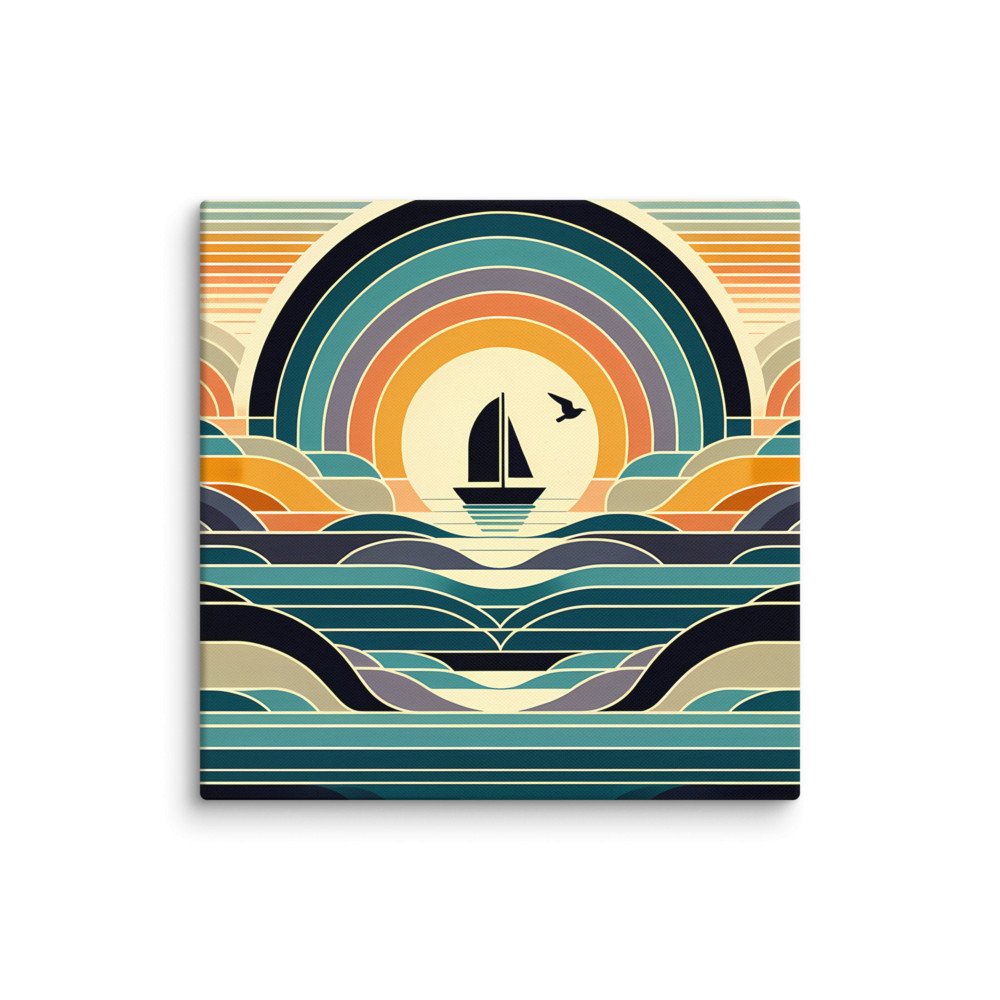 Geometric Sailboat Sunset Over Layered Waves — Canvas Print