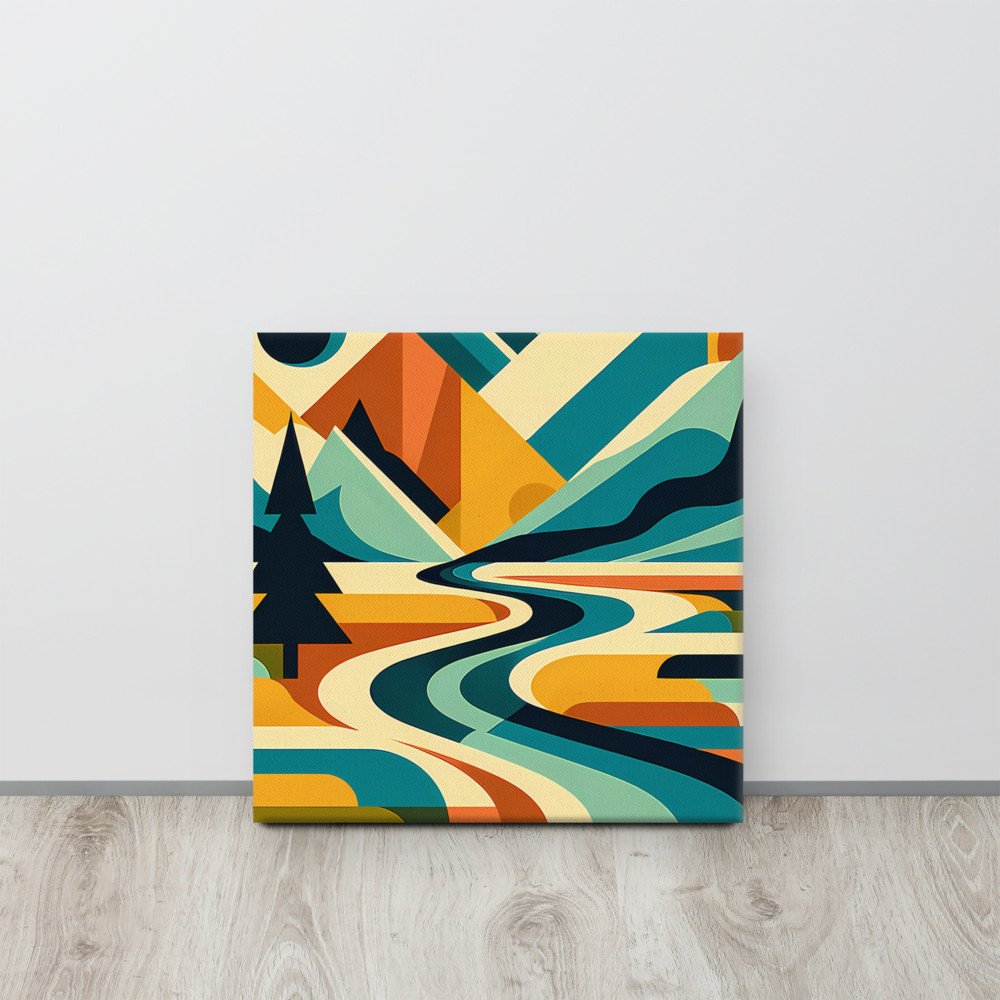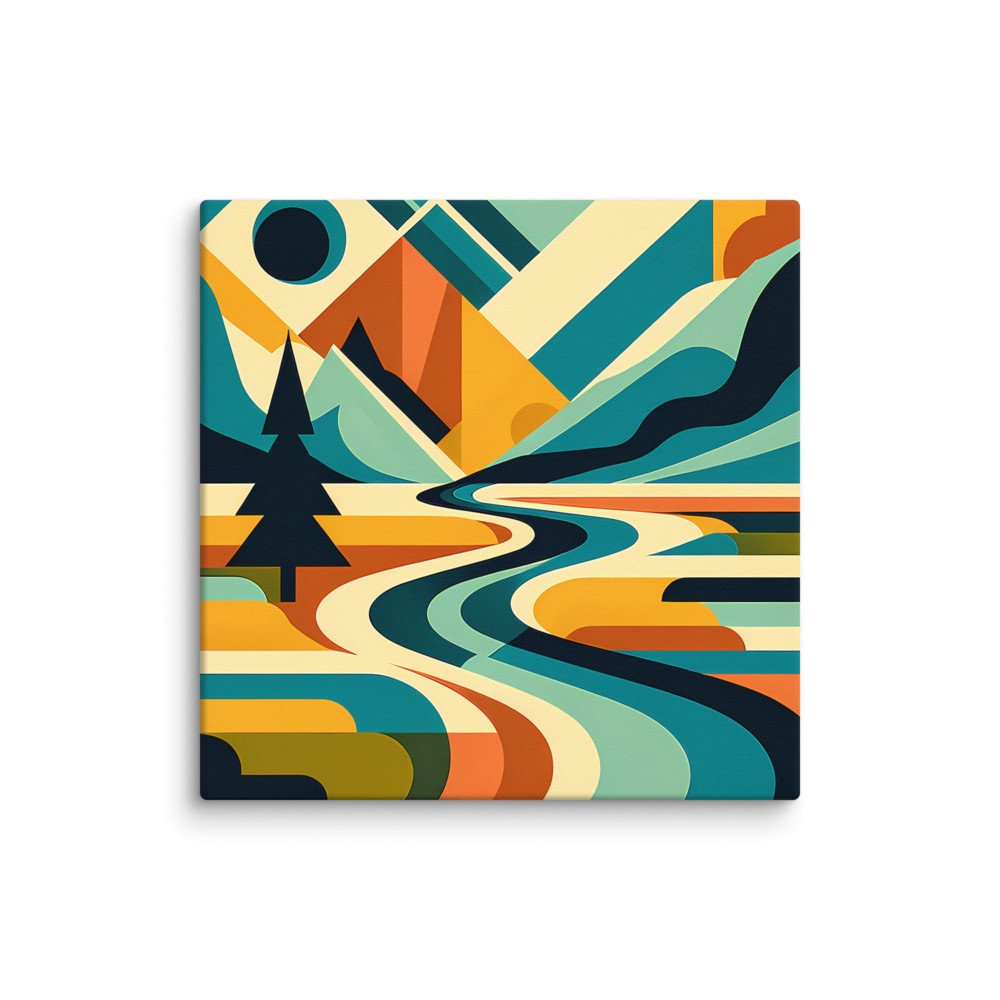 A stylised geometric landscape with angular peaks, a winding river and a dark pine silhouette under a bold circular sun. Teal, cream, mustard and burnt orange shapes create an abstract mountains composition with a clean minimal mountains feel. The layered forms and flowing curves blend nature geometry with a modern retro palette.
