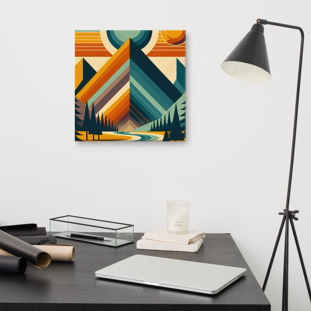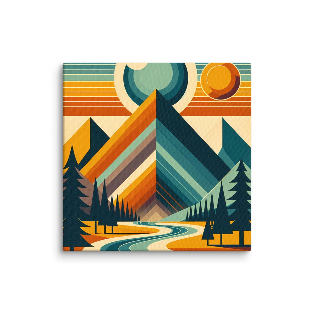 A bold geometric landscape featuring layered mountain peaks, tall pine silhouettes and a winding river beneath circular suns. The composition blends warm orange and gold tones with cool teal shades for a striking abstract mountains scene. Clean lines and balanced shapes give it a minimal mountains aesthetic with a retro-inspired finish.