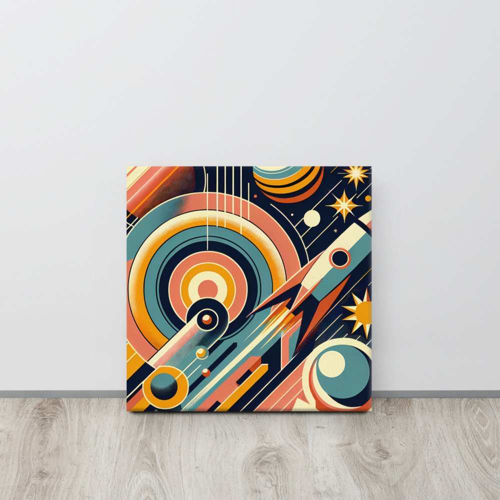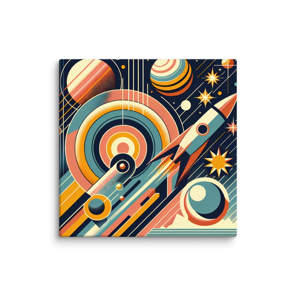 A stylised rocket cuts through a cosmic scene of concentric circles, planets and radiant stars in bold geometric forms. The composition blends retro space-age imagery with geometric typography poster energy, using warm orange, cream and teal against a deep navy background. Crisp lines, layered shapes and halftone shading give it a modern type design feel despite the celestial subject.
