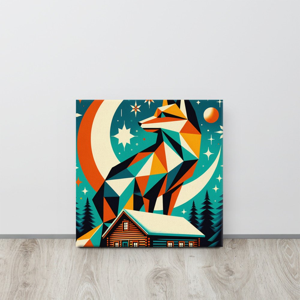 A geometric fox stands before a glowing crescent moon above a snow-covered cabin and dark pine trees. The bold angular shapes and cold colour palette create a striking winter minimalist look with hints of abstract snowflakes and scandi winter styling.