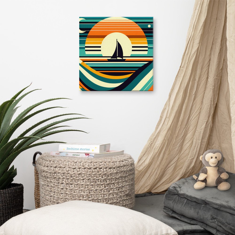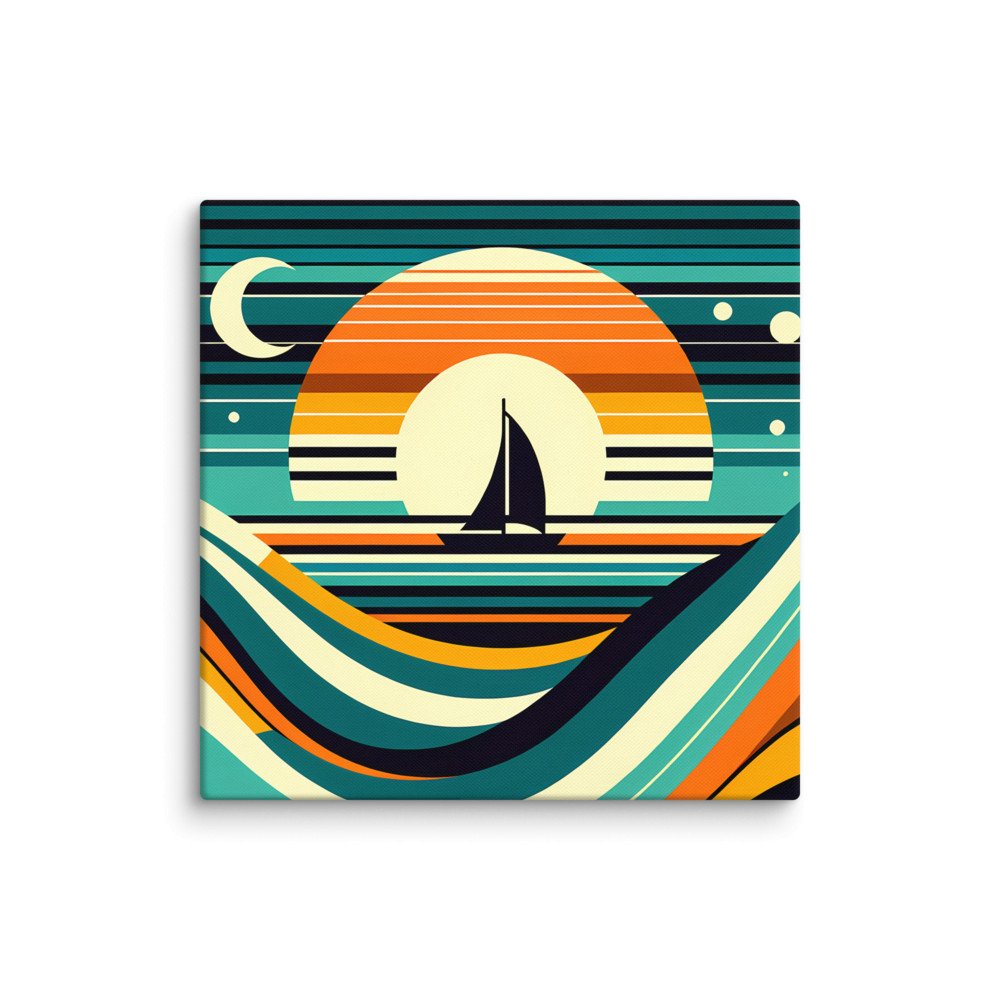 A stylised sailboat sits against a striped sunset with a crescent moon, stars and flowing layered waves. Bold teal, cream and orange bands create a geometric gradient look with a modern abstract feel. The clean lines and colour fade art influence give the scene a striking retro-futurist atmosphere.