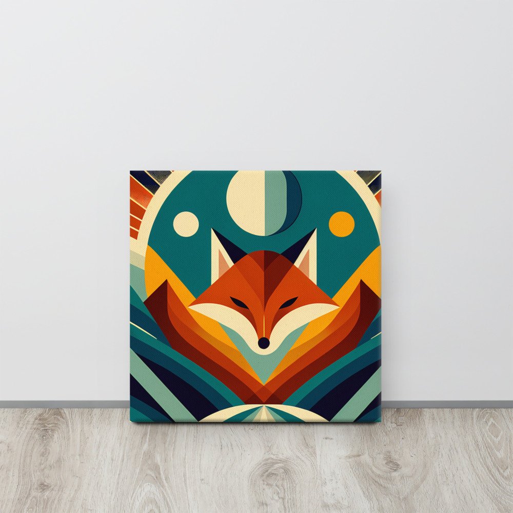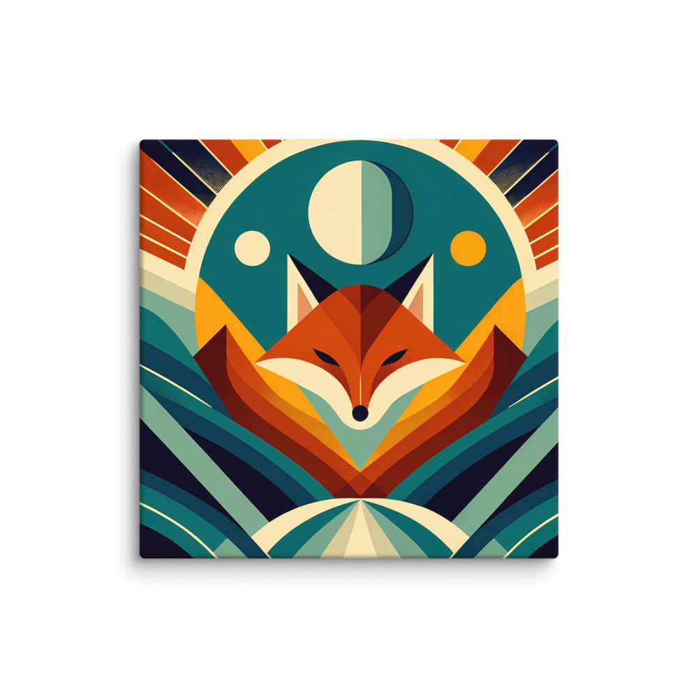 A stylised fox portrait is built from bold geometric shapes, layered arcs and radiant lines. Warm orange and cream tones contrast with deep teal and navy, creating a balanced wildlife composition beneath a moonlit sky. The symmetrical layout gives this fox design a sleek, modern feel.