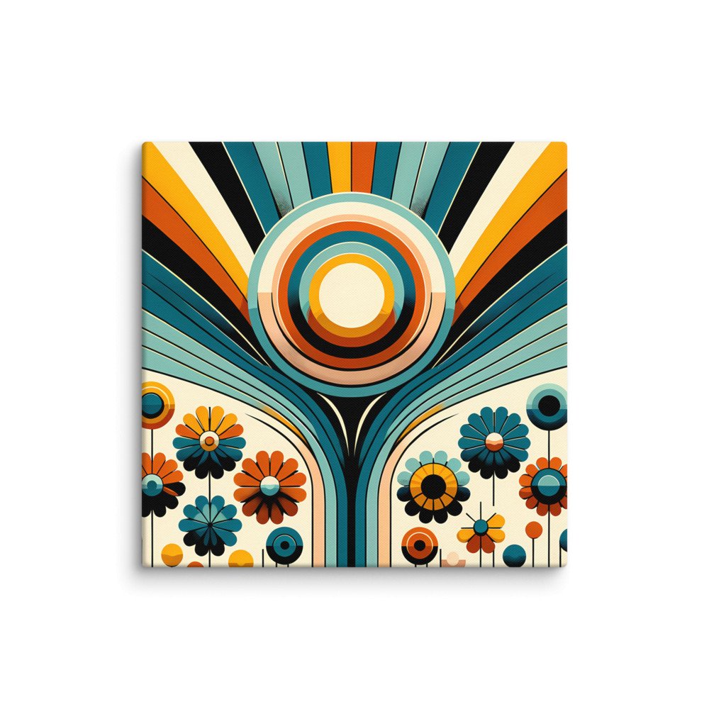A bold geometric flowers composition with a radiant circular sunburst and stylised blooms in teal, orange, cream and black. Clean symmetry, layered arcs and graphic petals give it a striking abstract botanical look with a retro modern feel.