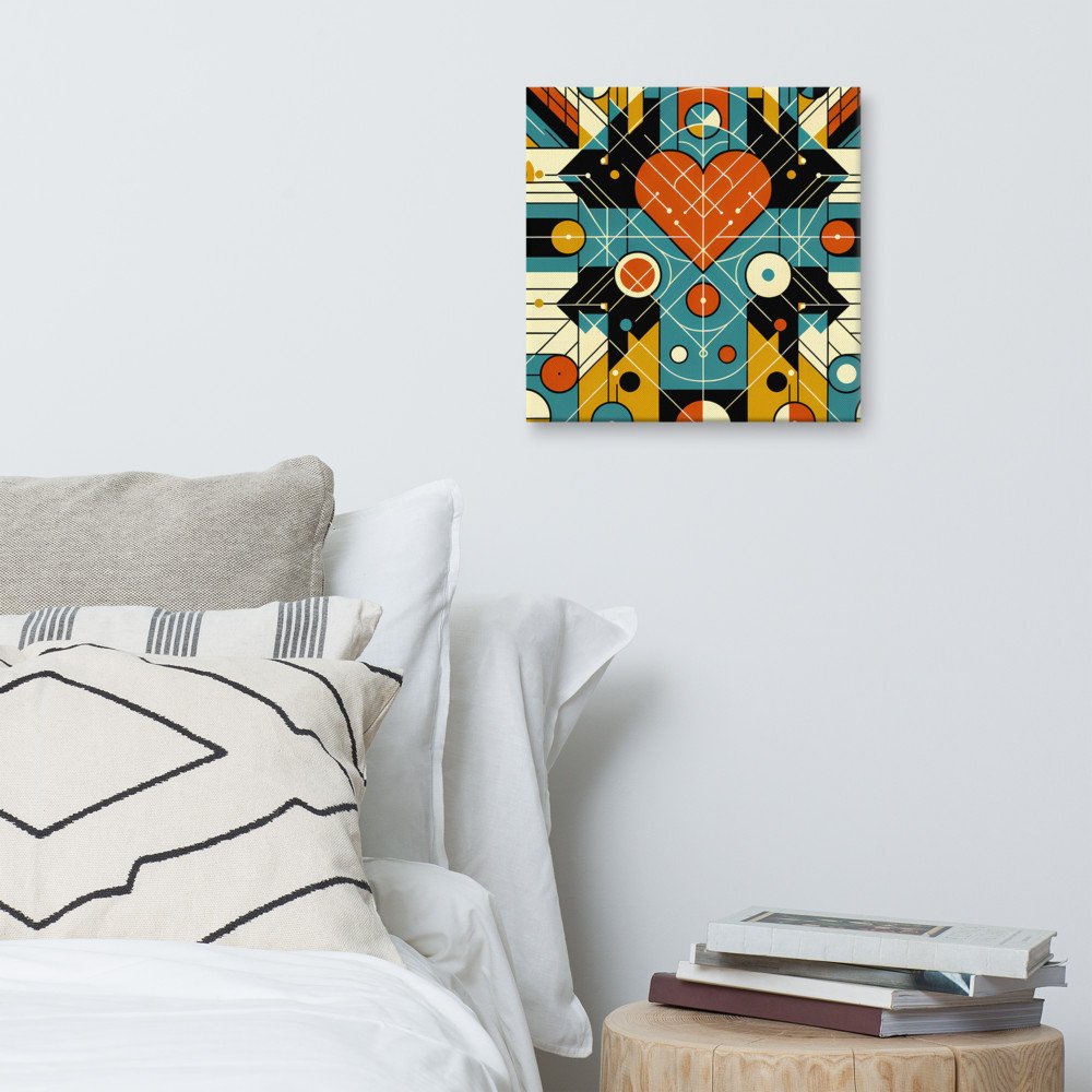 Mounted on a deep 1.25" frame, this ready-to-hang canvas gives the abstract composition a tangible, textured presence. The geometric heart structure, rendered in a striking mid-century palette, becomes a focal point with gallery-ready depth.