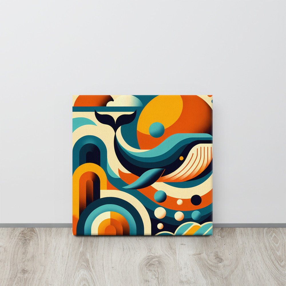 Retro Geometric Whale in Teal and Orange Waves — Canvas Print