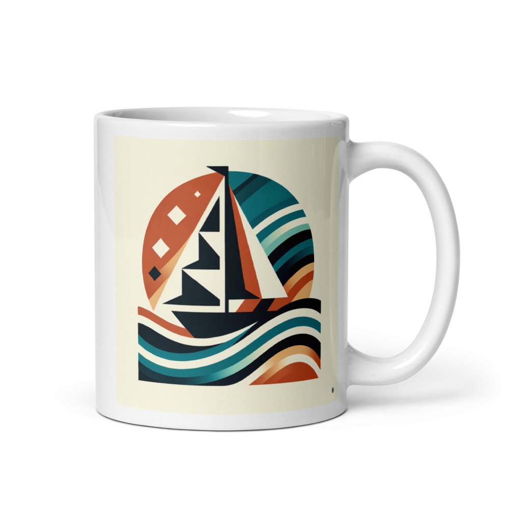 Retro Geometric Sailboat on Teal Waves Sunset — Mug