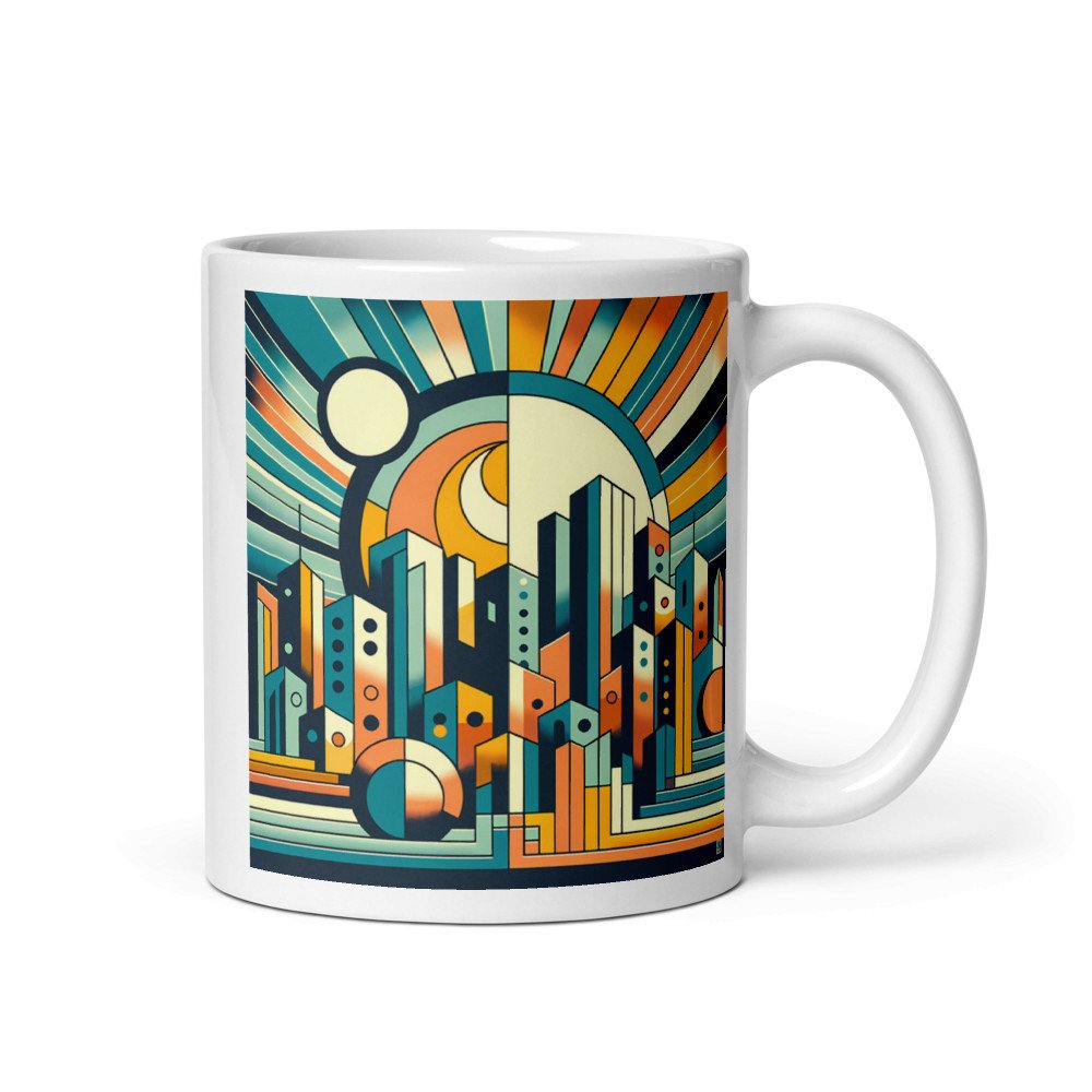 Geometric City Skyline with Sunburst — Mug