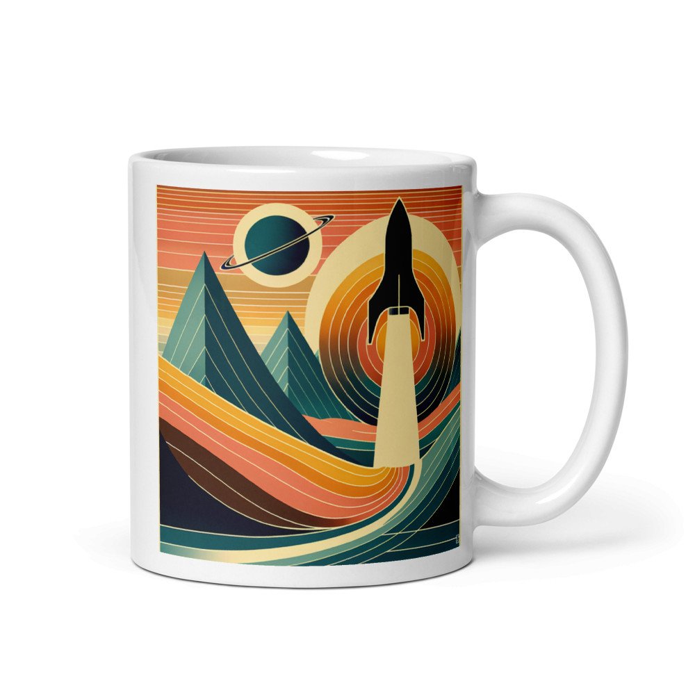 Retro Rocket Launch Over Geometric Mountains — Mug