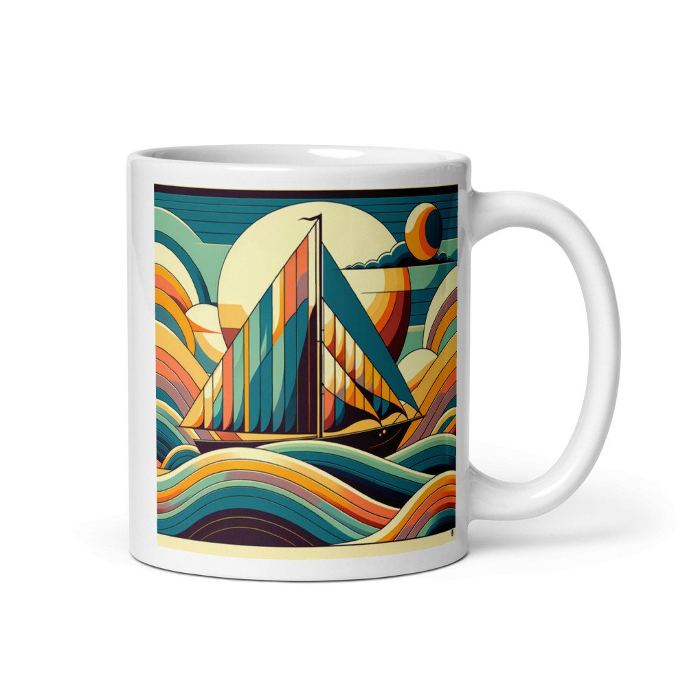 A stylised sailboat cuts through layered, ribbon-like waves in teal, cream, and warm sunset tones. The sails form bold, geometric shapes with clean lines and a modern, graphic rhythm. This illustration leans into bold typography-inspired forms and abstract type energy without using text.