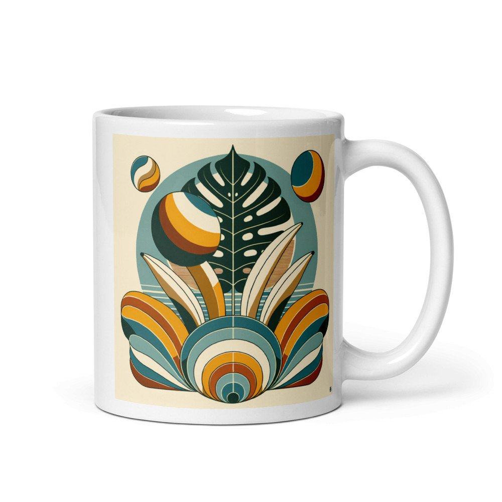 Start the day with the balanced composition of layered botanical shapes and clean arcs. This glossy ceramic mug features a wraparound print of the geometric leaf, and its dishwasher-safe finish ensures the crisp design lasts.