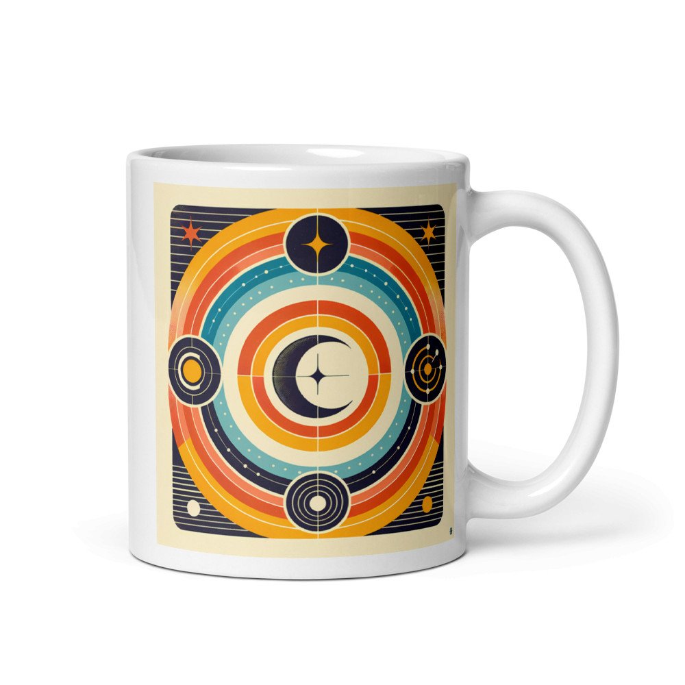 The glossy ceramic surface showcases the full wraparound panorama of this cosmic design. Each sip brings the detailed concentric circles and astral symbols of the warm orange and gold composition into view.