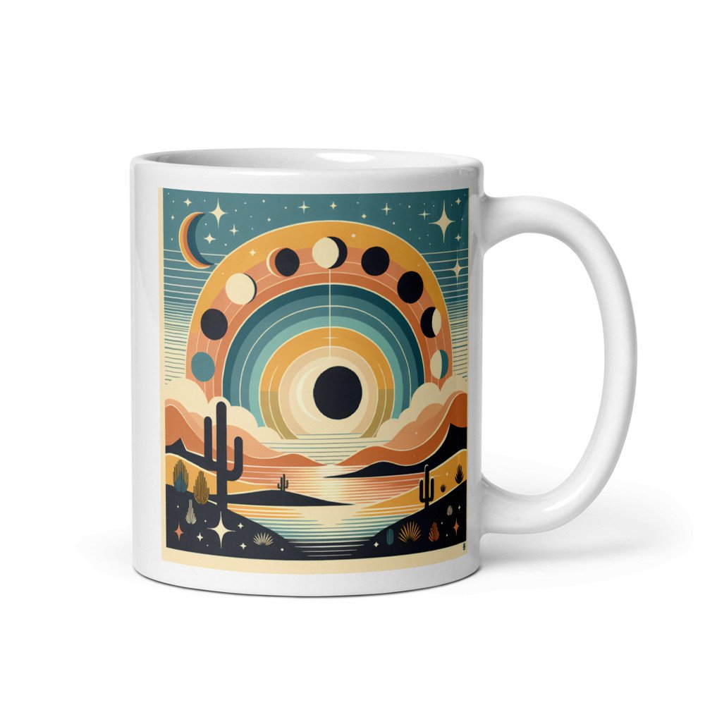A stylised desert landscape with cacti, layered hills, and a glowing sun framed by concentric geometric arcs. A ring of moon phases and scattered stars create a celestial minimal composition in warm ochre and cool teal tones. The design blends abstract astronomy with a retro-inspired palette and clean linework.