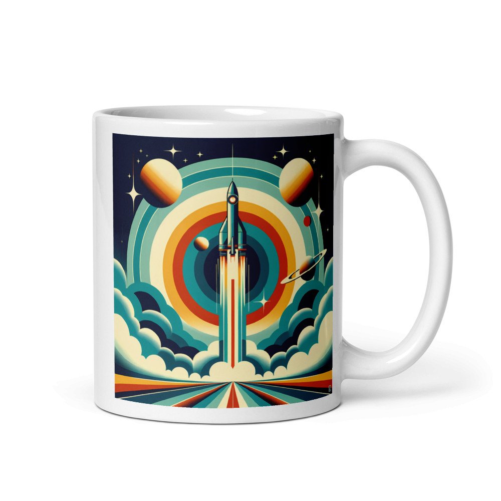 Retro rocket launch with planets and concentric rings — Mug
