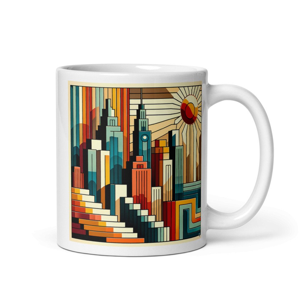 A stylised city skyline rises in layered blocks beneath a radiant sun, using warm orange, cream and teal tones with crisp black outlines. The composition blends geometric typography influences with abstract letterforms, creating a bold, modern typographic feel through architectural shapes and structured lines.
