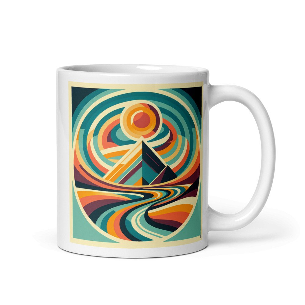 A bold geometric landscape featuring layered triangle mountains, a radiant circular sun and a winding river in sweeping bands of teal, orange and cream. The composition blends minimal mountain forms with retro-inspired curves for a striking outdoor minimalist look. Clean shapes and nature geometry create a vivid, balanced scene.