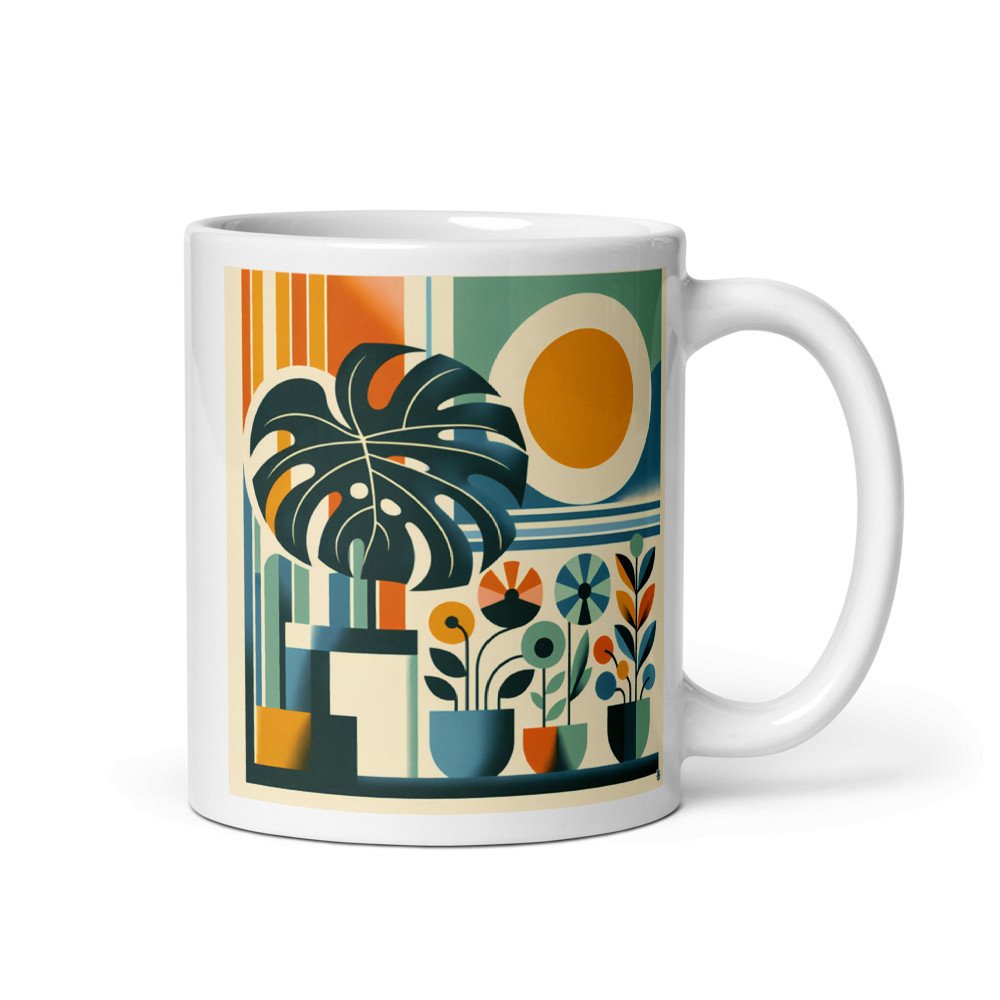 Abstract Monstera Leaf with Sun and Geometric Waves