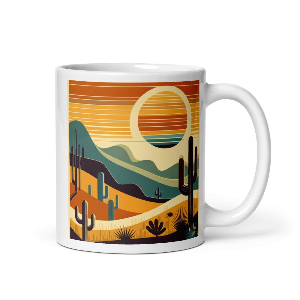 A stylised desert scene with layered hills, tall cacti and a striped sun framed by a bold arch. The warm terracotta palette contrasts with muted teal tones for a clean desert modern look. This southwest abstract composition uses smooth curves and graphic lines to create a calm, retro-inspired landscape.